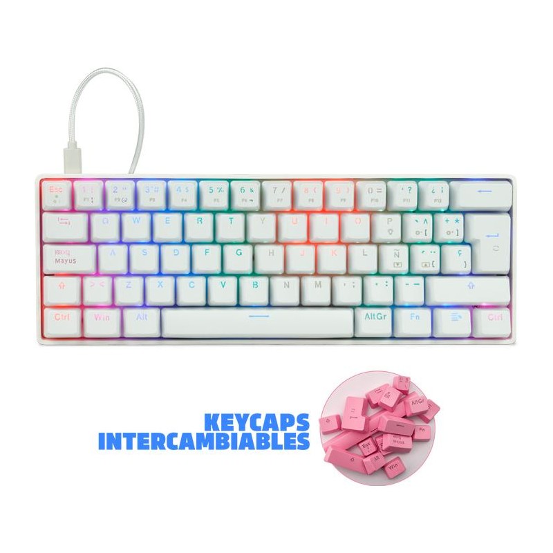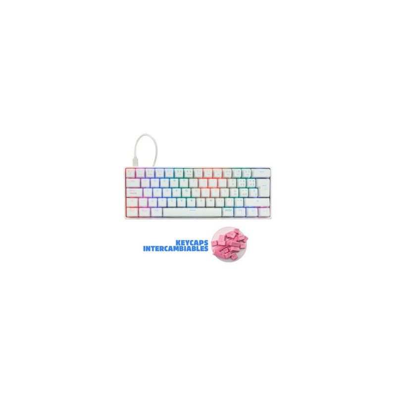 Reviews,KBG560-WHOlvídate de los estorbosos teclados del pasado, lo de hoy son los teclados 60%.CARACTERISTICASPERSONALÍZALOEl KBG560-WH incluye 15 teclas en color rosa para que puedas personalizarlo.Agrega las Keycaps extras incluidas para una apariencia más custom, cambia su cable Tipo C removible por uno de tu color favorito o reemplaza las teclas a tu gusto. SWITCHES GATERONEl teclado está fabricado con switches Gateron Red que permiten una sensación suave y lineal cada que presionas una tecla.COMPACTOA parte de tener un look genial, el KBG560-WH es compacto, lo que lo hace ideal para llevarlo a torneos o Lan Partys.RGBEl KBG560-WH está equipado con iluminación RGB personalizable, cuenta con todos tus modos favoritos de iluminación, elige tu modo y color favorito utilizando las teclas y si quieres una experiencia personalizada, descarga el software para controlarlo.ESPCIFICACIONESModelo: KBG560-WHProducto: Teclado gamer mecánicoFactor Forma: 60%Iluminación: RGBConectividad: USBVoltaje: 5 V cc, 180 mAPlug and Play: SiCantidad de teclas: 61Tipo de switch: Gateron rojoMaterial: MetalIdioma: EspañolLongitud Cable: 1.5 mDIMENSIONES Y PESODimensiones: 29 x 10 x 4 cmPeso: 640 g(BTM)
