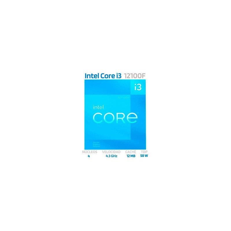 Reviews,PRODUCTIVIDAD Y ENTRETENIMIENTO, TODO DISPONIBLE EN TU COMPUTADORA DE ESCRITORIO.INTEL Core I3 12100F para todo tipo de profesionales, asegura el mejor rendimiento de las aplicaciones, de la transferencia de datos y la conexión con otros elementos tecnológicos.ESPECIFICACIONESN.º de núcleos de rendimiento: 4Subprocesos totales: 8Caché: Caché inteligente Intel® de 12 MBZócalos compatibles: FCLGA1700Velocidad del bus: 64 bitsTDP: 58wFRECUENCIASFrecuencia turbo máxima: 4.30 GHzFrecuencia turbo máxima de núcleo de rendimiento: 4.30 GHzFrecuencia base de núcleo de rendimiento: 3.30 GHzESPECIFICACIONES DE LA MEMORIATamaño máximo de memoria (depende del tipo de memoria: 128GBTipos de memoria: Hasta DDR5 4800 MT/s | Hasta DDR4 3200 MT/sNúmero máximo de canales de memoria: 2Ancho de banda de memoria máximo: 76,8 GB/sOPCIONES DE EXPANSIÓNEscalabilidad: 1S solamenteRevisión de PCI Express: 5.0 y 4.0Configuraciones de PCI Express: Hasta 1x16+4, 2x8+4Cantidad máxima de líneas PCI Express: 20Dimensiones4.5 x 3.75 cm(BTM)