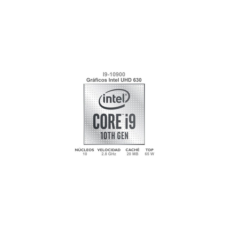 Reviews,INTEL CORE I9Aprovecha al máximo tus juegos con velocidades de reloj de hasta 5.2 GHz, 10 núcleos, 20 subprocesos y asistencia actualizada para dispositivos de ancho de banda alto. Las funciones integradas como la tecnología Hyperthreading Intel® e Intel® Thermal Velocity Boost permiten una capacidad de juego increíble, mientras que los controles de overclocking nuevos ofrecen mayor flexibilidad para un desempeño preciso.CONVIERTA SU COMPUTADORA EN UN CENTRO DE ENTRETENIMIENTODisfrute de un centro de entretenimiento sorprendente, en el cual puede transmitir videos 4K UHD, utilizar la potencia para realidad virtual y reproducir los videojuegos más exigentes. Debido a que tiene cuatro veces más píxeles que la resolución HD tradicional, puede disfrutar de imágenes realistas y nítidas, degradación compleja y frecuencias rápidas de cuadros.ESPECIFICACIONESCantidad de núcleos: 10Cantidad de subprocesos: 20Frecuencia básica del procesador: 2,80 GHzFrecuencia turbo máxima: 5,20 GHzZócalos compatibles: FCLGA1200Caché: 20 MB Intel® Smart CacheVelocidad del bus: 8 GT/sTDP: 65 WMEMORIATamaño de memoria máximo (depende del tipo de memoria): 128 GBTipos de memoria: DDR4-2933Cantidad máxima de canales de memoria: 2Máximo de ancho de banda de memoria: 45.8 GB/sOPCIONES DE EXPANSIÓNEscalabilidad: 1S solamenteRevisión de PCI Express: 3,0Configuraciones de PCI Express: Hasta 1x16, 2x8, 1x8+2x4Cantidad máxima de líneas PCI Express: 16GRÁFICOS DEL PROCESADORGráficos: Intel UHD 630Frecuencia base: 350 MHzFrecuencia dinámica máxima: 1.20 GHzGráficos video máx. memoria: 64 GBSoporte 4K: Sí 60HzDIMENSIONESTamaño de paquete: 37.5mm x 37.5mm(DRC)